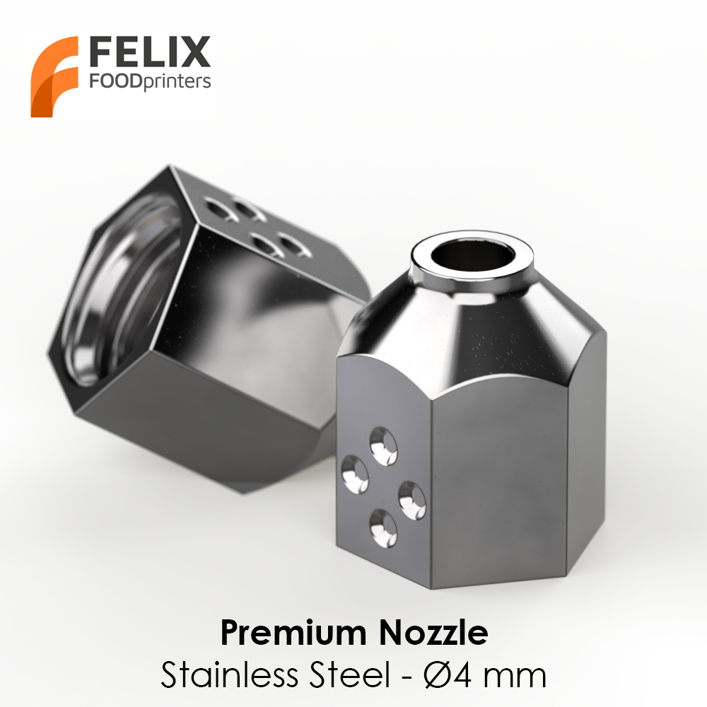 Discover the optimized stainless steel nozzle for Felix Premium food printers, an essential upgrade for anyone working with materials such as chocolate or dough. Specially developed by Felix, this nozzle features a precise 4mm output, allowing you to create prints in a very vast way. It ensures superior performance and compatibility with food and medical applications, where standard Luer nozzles fall short. Opt for reliability and precision with the Felix Premium nozzle.